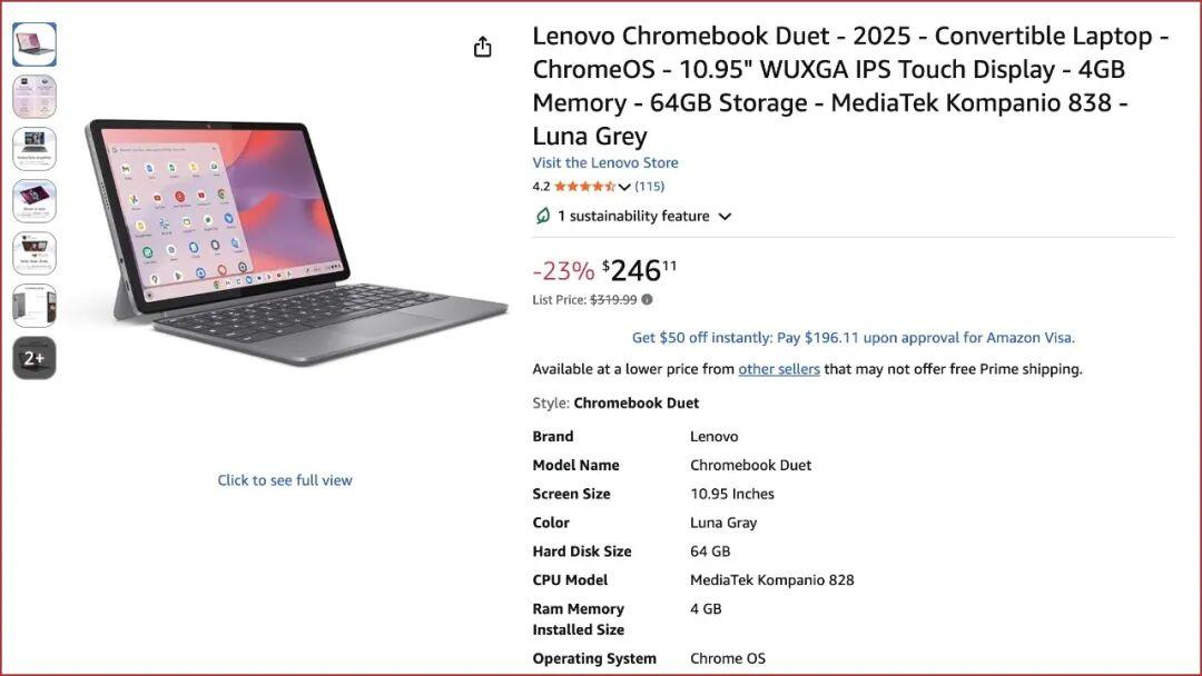 比如亞馬遜上有這麼一款在售的「聯想 Chromebook Duet 2025」,配置如下: