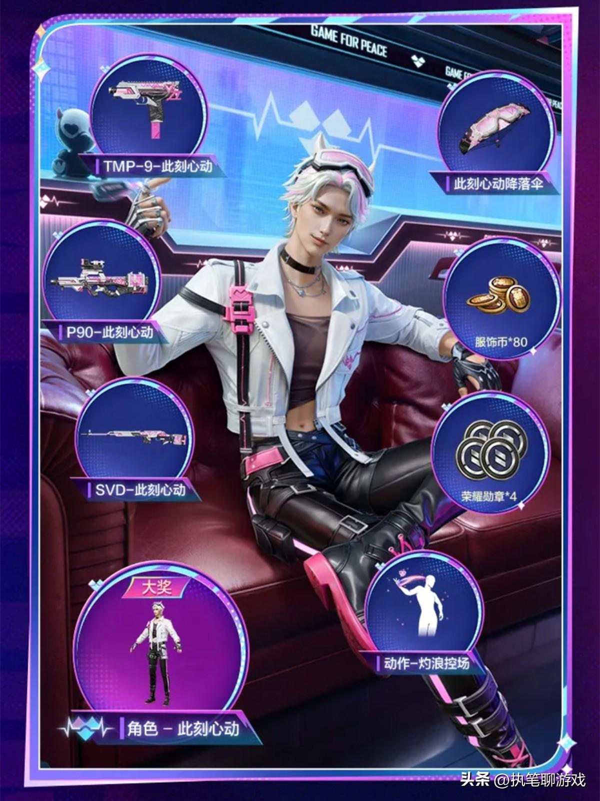 如圖所示,“此刻心動”作爲小轉盤系列,擁有1個角色、P90、SCD、TMP-9、降落傘以及專屬動作灼浪全場。