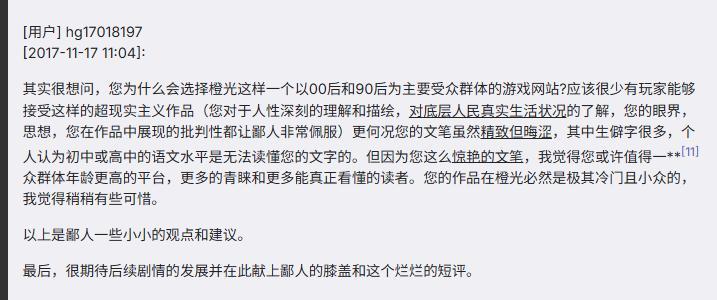 在挖到遊戲本體後,“梅塔的長名字”又通過橙光的api查到了《嘲哳》評論區,其中一條評論是這麼寫的——