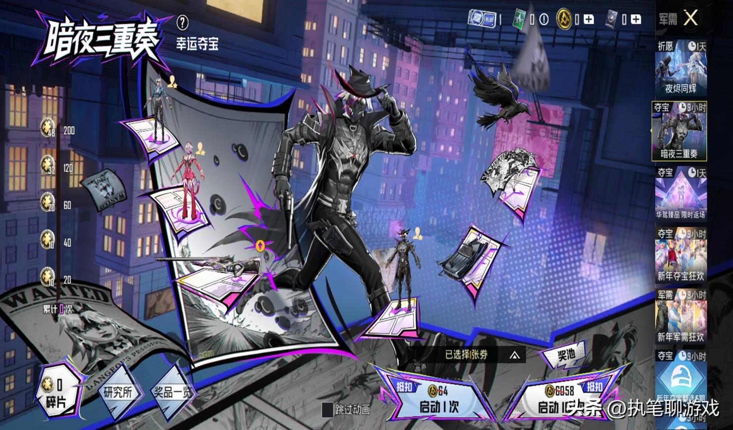 第一個倒計時屬於“奪寶轉盤”,也就是我們玩家口中的中轉盤,這個系列名叫“暗夜三重奏”,屬於《和平精英》比較少有的塗鴉風格。