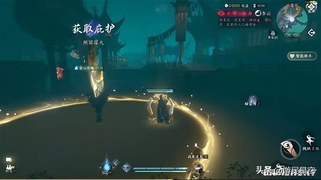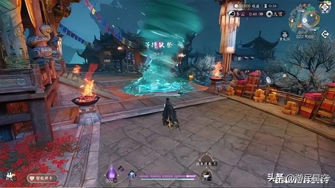 比如“霧瘴襲身,閉戶求存”,便對應着地圖中隨機出現的“濃霧”天氣。當霧氣瀰漫時,玩家在室外會因爲持續受到瘴氣侵蝕而掉血,只有進入室內,或是找到特定的“照冥犀火”才能躲避。而這場濃霧背後還藏着一個特殊的BOSS——守夜人。只要你在迷霧中找到並擊敗他,霧氣便會自動消散。