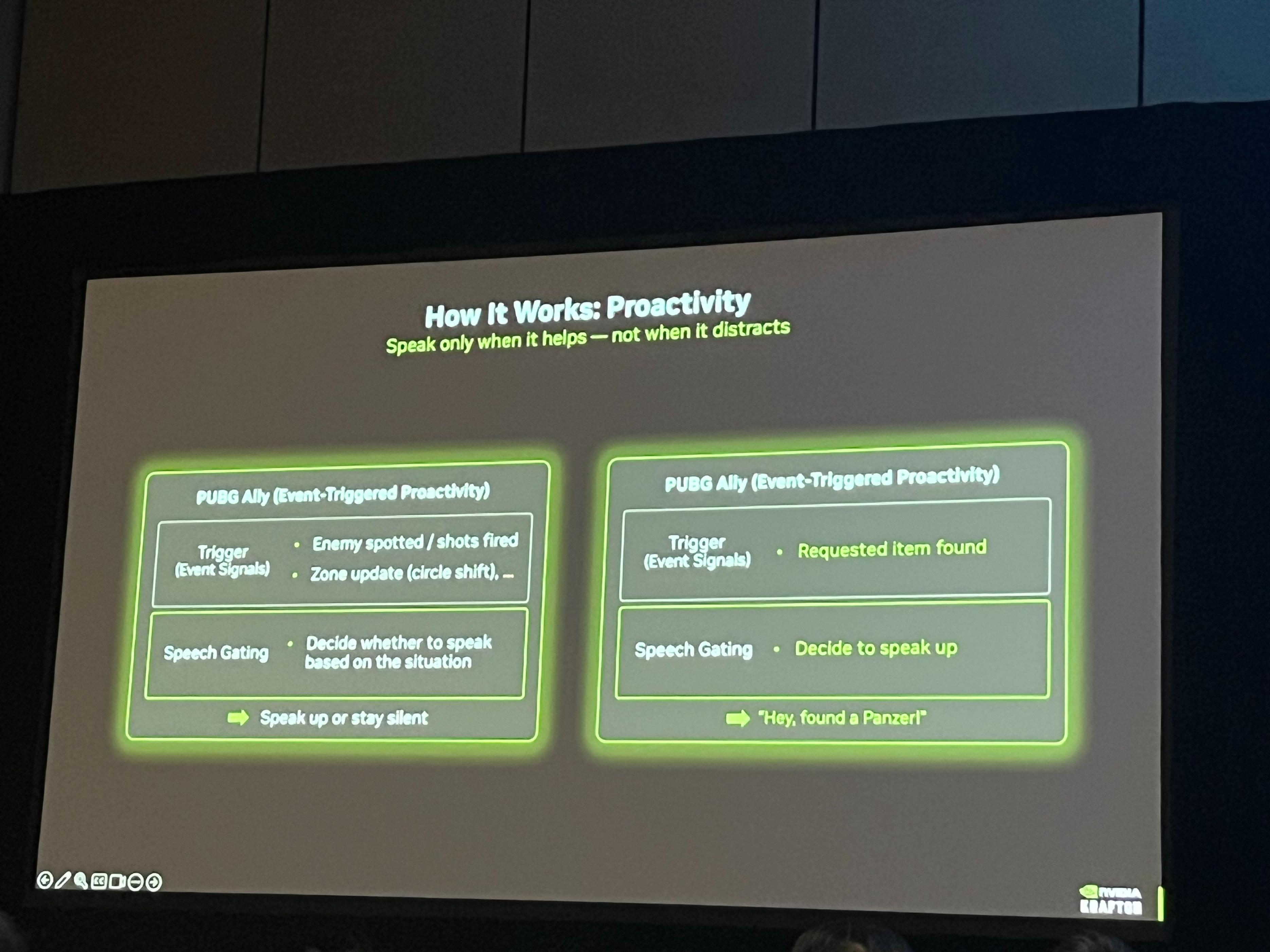 我們的做法有兩點:第一,基於遊戲內的事件觸發,比如發現敵人、開火、毒圈收縮等場景;第二,結合遊戲實際情況判斷是否需要主動發言,因爲過多的語音會分散玩家的注意力。我們的目標很簡單:在合適的時機,給出有幫助的語音提示。