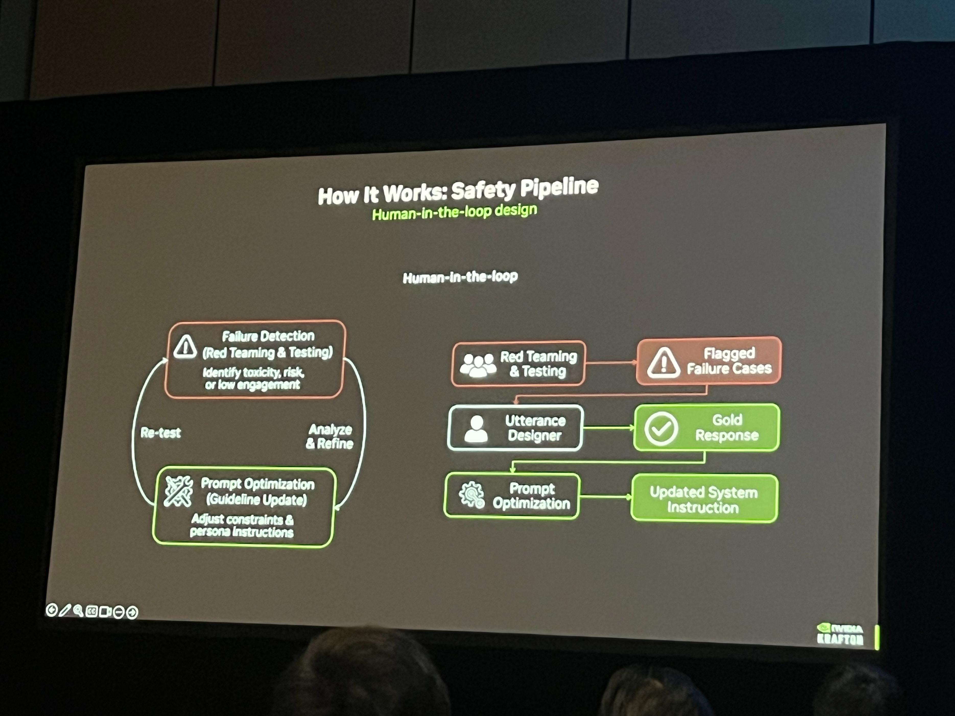 由於安全性至關重要,最後一道關卡就是不良用語檢測。這個檢測會在兩個環節生效,覆蓋艾爾琳的聽和說。首先在語音輸入環節,玩家的語音被轉文字後,我們會對轉換後的文本進行不良用語檢測,若發現違規內容,會直接屏蔽或替換,避免艾爾琳做出不當回應;其次在AI生成回覆環節,在將文本轉換爲語音前,會再次進行檢測,若回覆中包含不良用語,會立刻修正。這是我們的最後一道風控防線,對輸入和輸出實現雙重檢測。