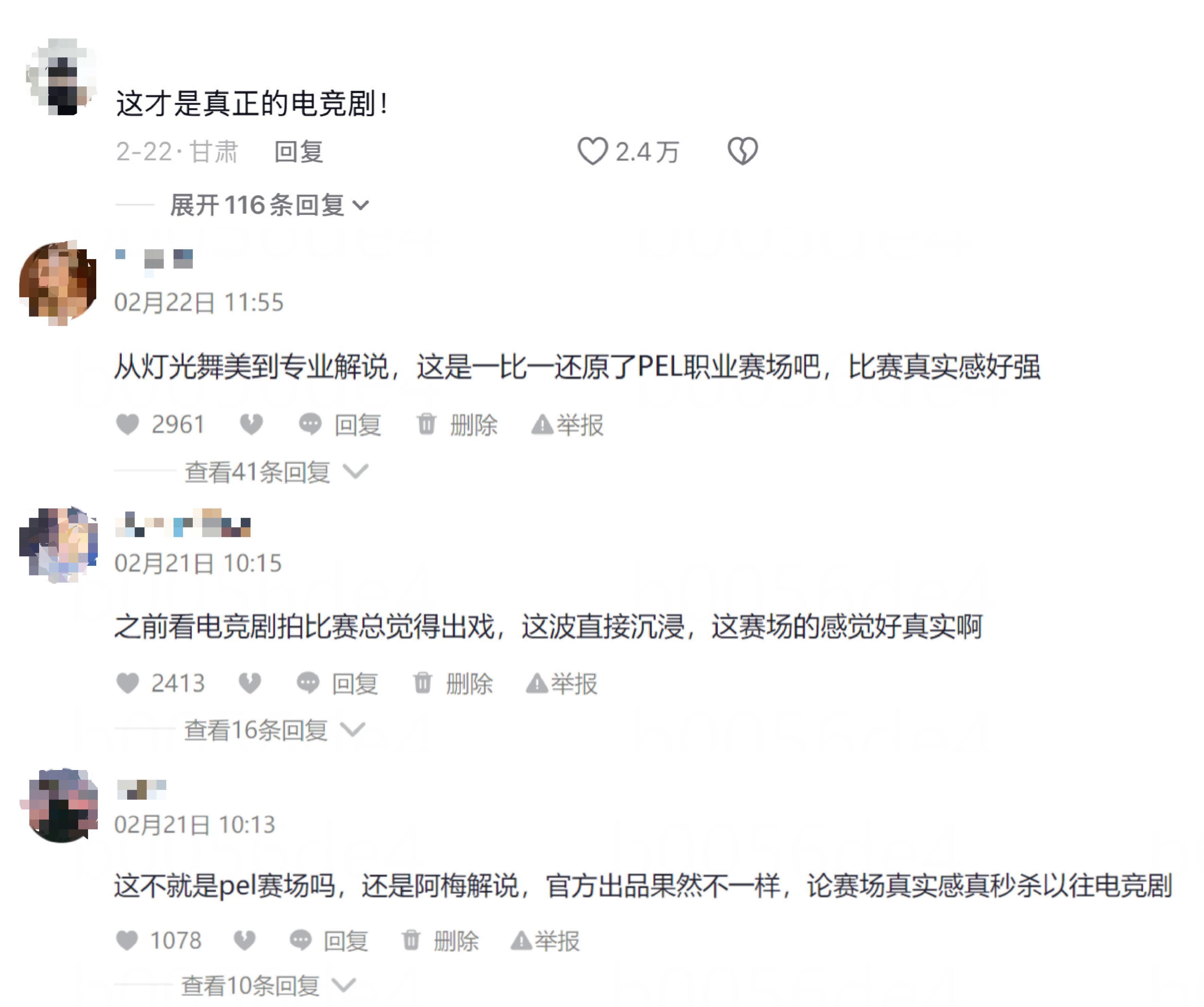 以韓澈魂穿易澤首次參加比賽那集爲例,阿梅(PEL官方解說)的那一聲開場,“氣氛一下子就上來了”。燈光、舞臺、道具陳設、粉絲應援、現場氣氛每一處細節都格外對味兒。也難怪,抖音評論區裏一條“這纔是真正的電競劇”的評價,收穫了2.4萬用戶的點贊。