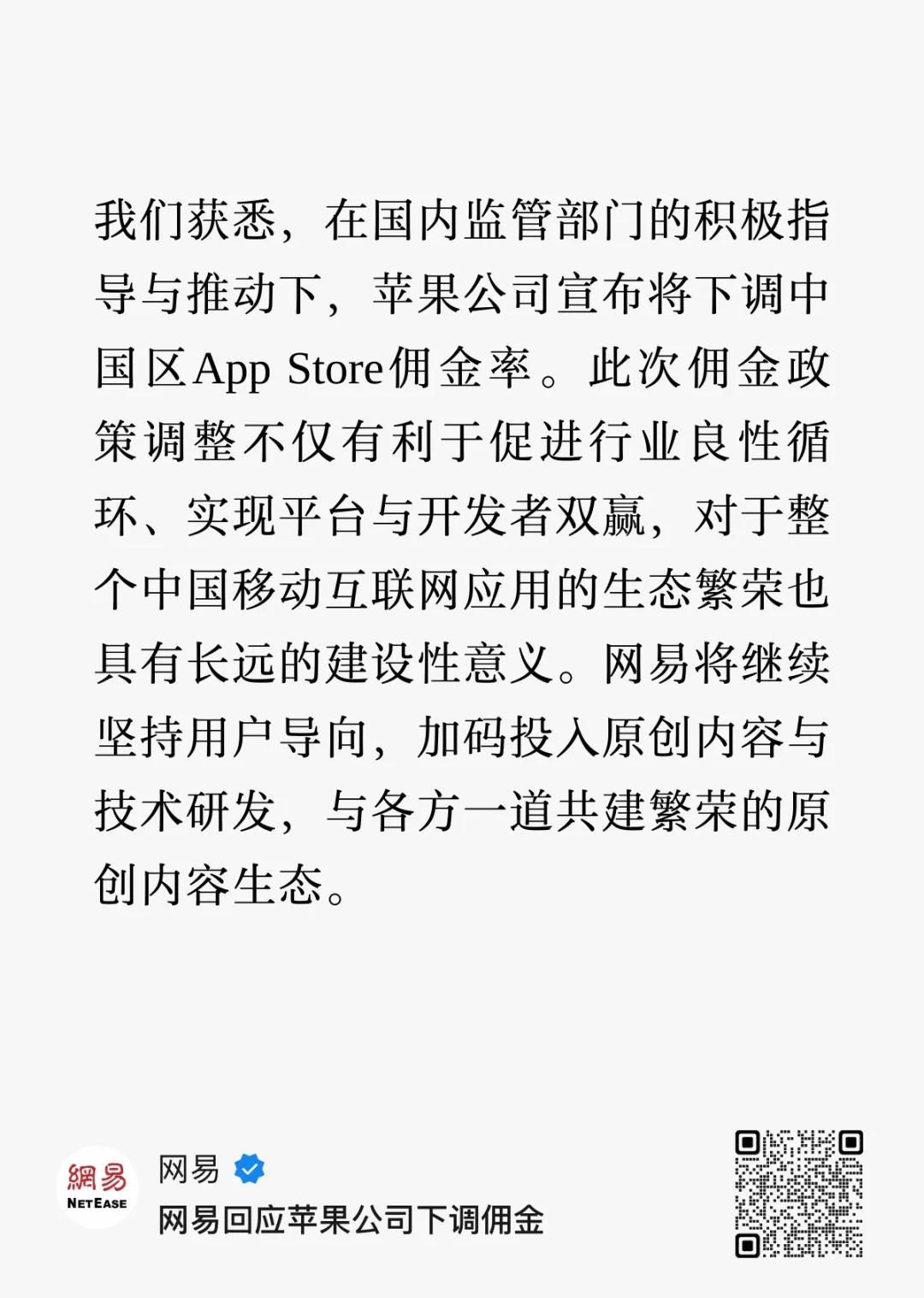 網易也發出聲明,表示“此次佣金政策調整不僅有利於促進行業良性循環、實現平臺與開發者雙贏,對於整個中國移動互聯網應用的生態繁榮也具有長遠的建設性意義。”