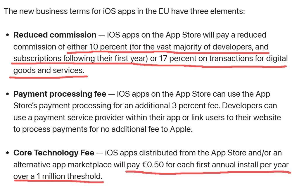 2024年1月,爲遵守《數字市場法案》DMA,蘋果在歐盟地區將抽成下調至17%(標準)或10%(中小企業)。
