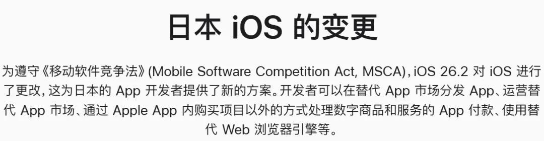 2025年12月,因爲日本推行《智能手機軟件競爭促進法》(MSCA),蘋果在日本地區的標準抽成從30%下調至21%,且開放第三方支付(蘋果對此類交易收取5%的核心技術佣金)。