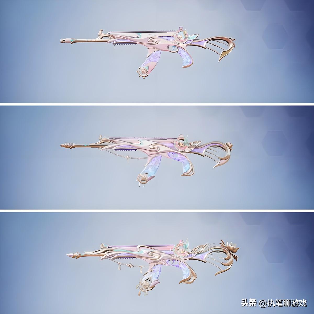 最後再來看此次的升級槍吧,主角是玩家們比較喜歡的ACE32,從基礎、進階、高級的外觀表現來看,光子重新建模,以粉色、金色爲主,並且加入了紫色水晶元素,看起來還是相當炫酷的。
