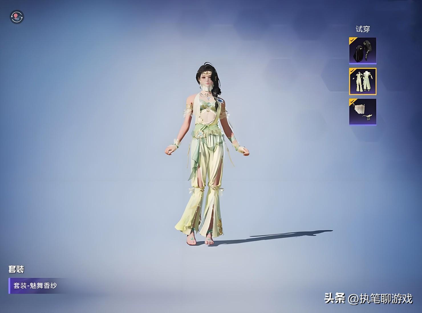 然後來看套裝,首先是“魅舞香紗”,這套衣服不算是常規類型的三件套,頭髮、衣服、面罩,鞋子無法IDY裝扮。