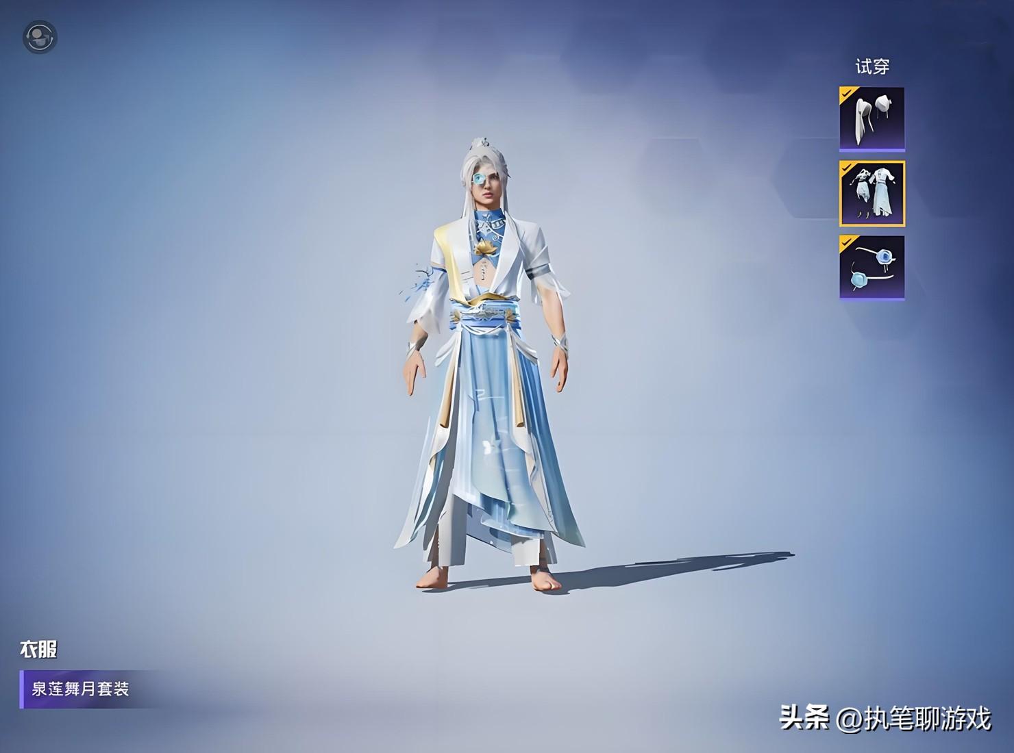 接下來出場的是男角色,與印象裏的“舞服”完全不同,看起來更像是仙俠玄幻風格的設計,白色長髮+藍色眼罩的設計,還是讓很多玩家眼前一亮的。