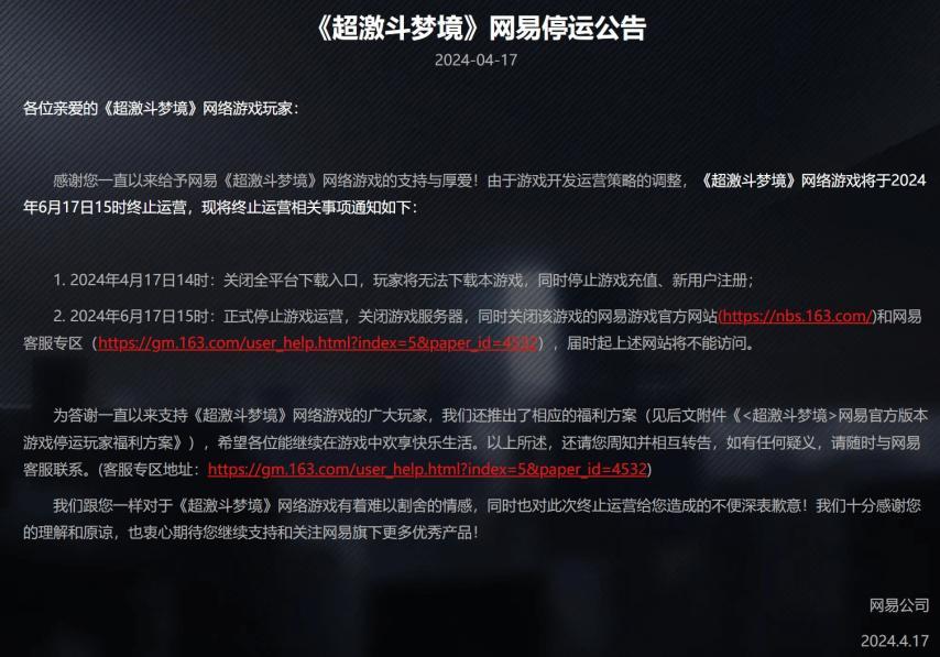 最終,在賽季服上線不到一年後,2024年4月,網易發佈了《超激鬥夢境》停運公告,遊戲將於6月17日正式關閉服務器。這個時間點,也適逢DNF手遊剛推出不久。