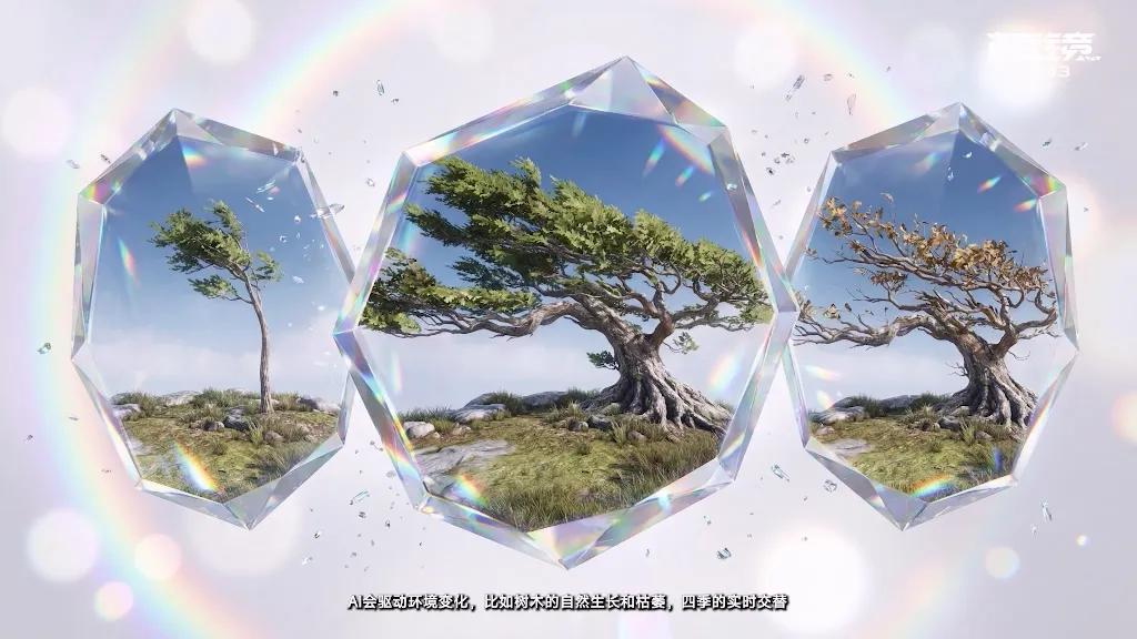類似的嘗試還有很多,比如AI會驅動環境和氣候的細微變化,讓樹木具備自然的生長和枯萎過程,讓四季實時交替。這時,有沒有澆水、天氣的變化、不同平行世界裏的自然規則,都會實時影響植物的狀態。