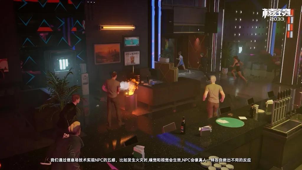 簡單舉個例子,常規的AI對話裏,AI只是根據上下文跟玩家聊騷,但在《棱鏡2033》實機演示中,對話能影響NPC行爲,當玩家和一個自動售貨機對話後,能突然把它嚇跑。