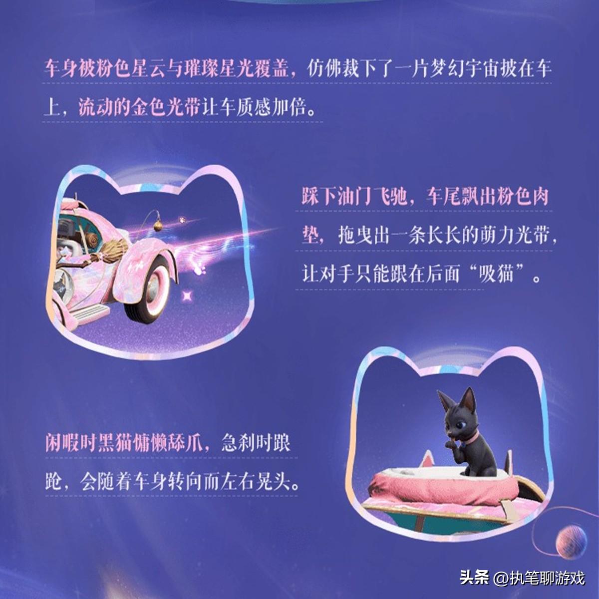 接下來再以“魔法喵窩”爲例,車尾飄出粉色貓爪特效,並且還會出現一條長長的萌力光帶,讓對手在車後“吸貓”;同樣在閒暇時會有動作表現,比如黑貓慵懶的舔爪子,急剎時還會踉蹌,並且還會隨着車身轉動方向而左右晃頭。