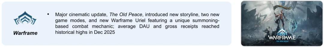 說完了兩大相對清晰的主要增長路徑,我覺得還有個值得關注的重點是海外市場,除了每年財報都在擔當海外增長主力的《PUBG Mobile》鎮場子,新的增長苗頭也出現了——2013年上線的《星際戰甲》在2024年創下年度收入新高後,2025年財報再次提及其月平均日活與流水因“大型版本更新”創歷史新高。