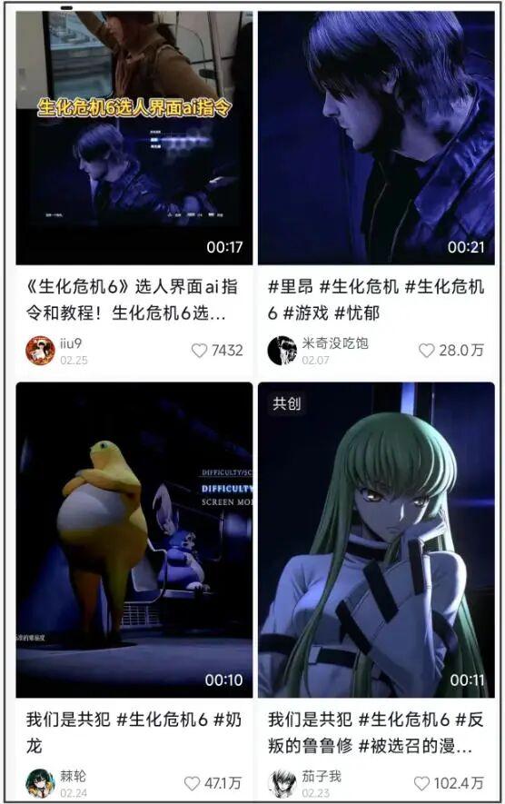 最近,《生化危機6》的選人界面,在各個平臺都火到不像話了。B站有一堆百萬播放的二創,抖音則更誇張,一堆動輒幾十萬、上百萬點讚的視頻。