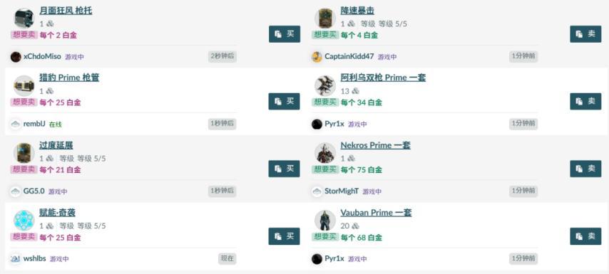 在那個“免費遊戲等於花錢買數值”的年代,DE的商業化極其的剋制,遊戲裏幾乎所有戰甲武器,都能靠“肝”免費做出來,而且核心付費貨幣“白金”也允許玩家間自由交易。這意味着白嫖黨可以靠肝去刷材料或者極品MOD,去換大佬手裏的白金。