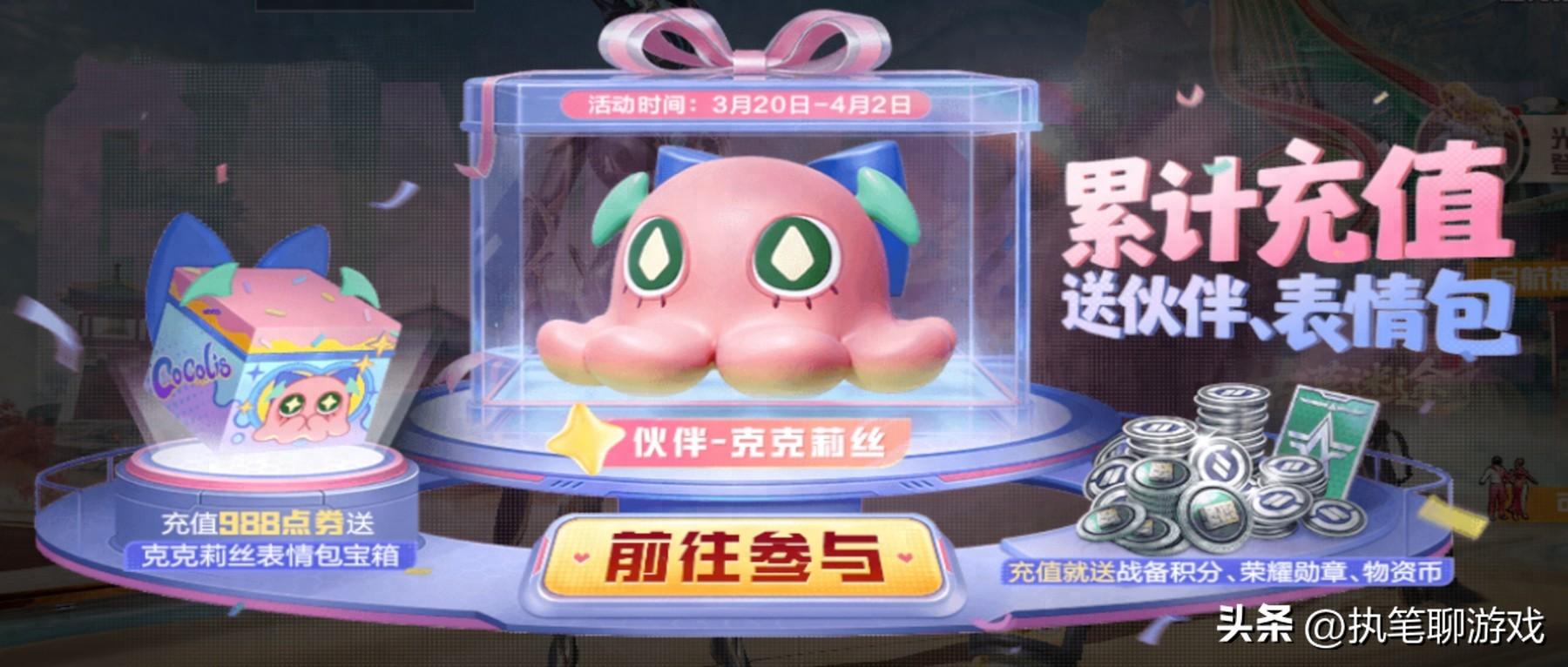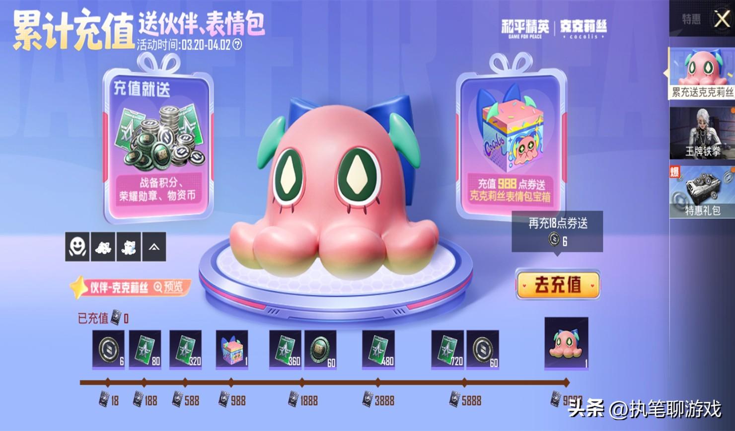 二月二龍抬頭,本以爲《和平精英》只會出現大轉盤“諸神破曉”以及自研品類的載具皮膚“萌寵漫遊”,結果卻冷不丁出現了一個全新的累充獎勵,而且還是一位老熟人,它的名字叫“剋剋莉絲”,粉嘟嘟的小章魚形象,看起來又萌又可愛。