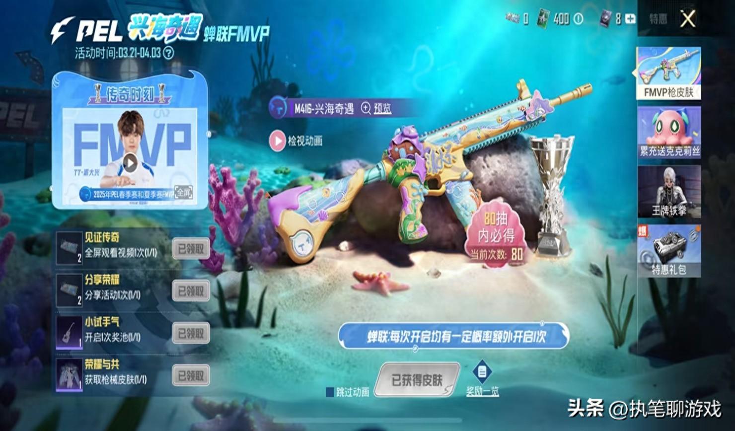 提到此次的FMVP定製槍星海奇遇M416,許多玩家都覺得顏值、品質俱佳,於是紛紛出手拿下,傳說中的“天選之子”只是1次就能抽到,但是“天選之黑”則是80次才能拿到,即便是不算積分,全部以“大保底”的方式來計算,也不過是160R點券。