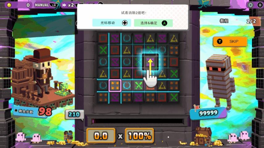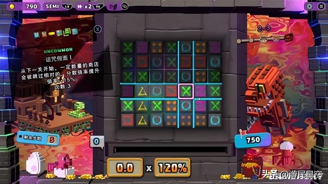 不過,過量的玩法堆砌很多時候會讓新入坑的玩家手忙腳亂,而這便是《奪寶磚家》半自動模式的主要作用:若玩家想要專心享受卡牌構築的樂趣,那麼開啓半自動模式便可以專注於肉鴿樂趣,而不用再費腦子去擔心額外操作;但如果玩家更喜歡操作的樂趣,那玩家大可以關掉半自動專注於方塊移動操作,從而享受卡牌構築+三消操作的雙重策略樂趣。