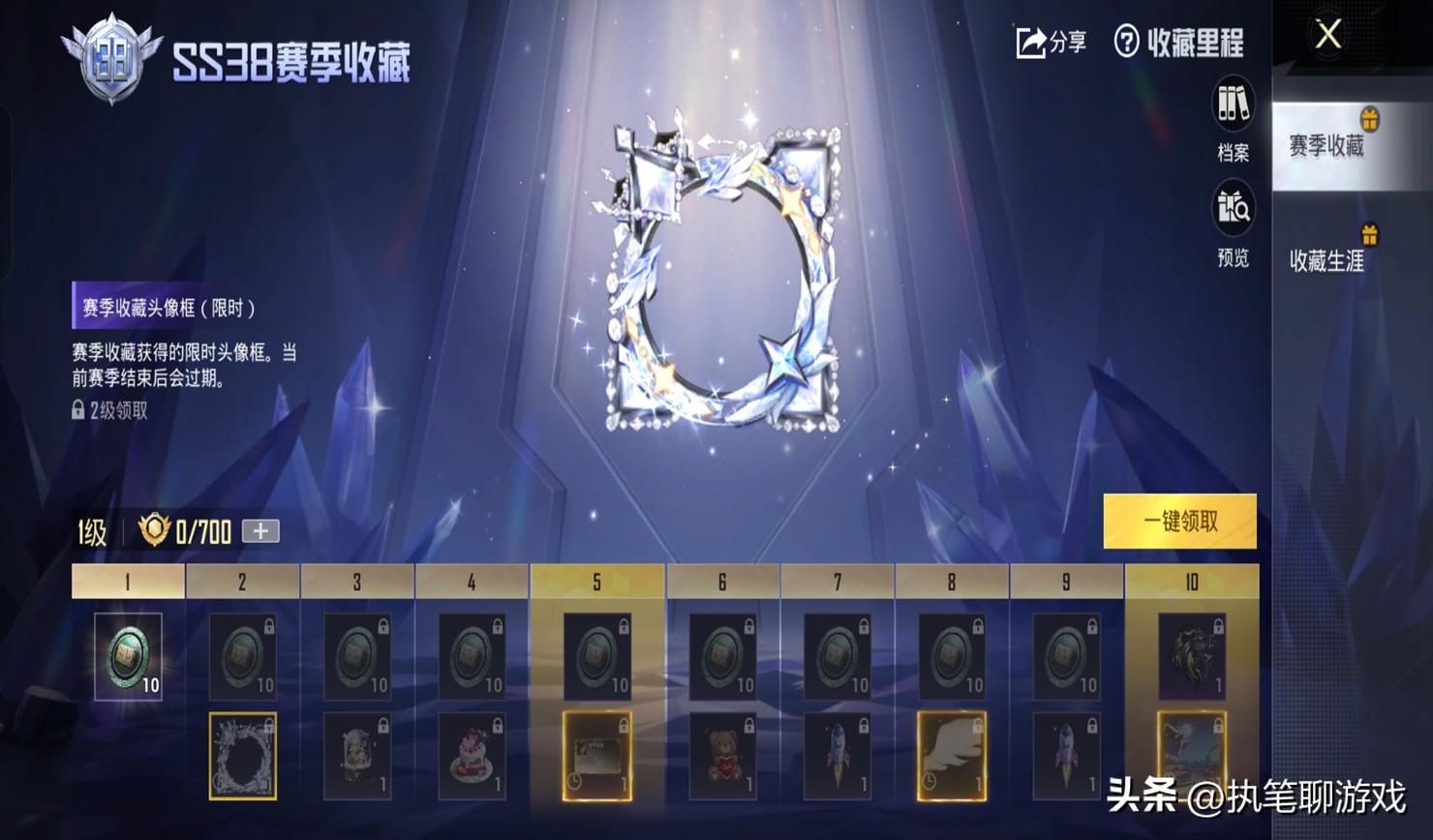 如圖所示,此次《和平精英》SS38賽季手冊的10個額外新獎勵中,不僅有專屬的背景,而且還有動態特效的頭像框,鑲着鑽石的皇冠還擁有動態表現,比起戰神頭像框都不遑多讓,甚至還要有過之而無不及。