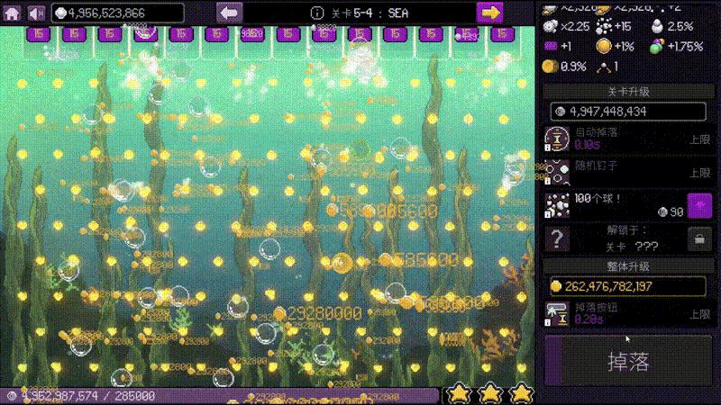 點擊 “掉落”,小球在五彩像素釘板上遵循物理規則彈跳、分裂、反彈,詭譎又迷人的路徑充滿未知驚喜!它們一路撞擊金幣、光點與繽紛特效,伴隨着清脆音效直奔獎勵桶,每一次碰撞都帶來即時滿足感。隨着釘板、獎池與小球屬性的逐步升級,金幣將從涓滴細流化作洪流噴湧,流光與爆閃粒子佔滿整個屏幕。疊加 Buff 與被動技能後,每一次掉落都可能觸發全屏金幣雨、倍率飆升的連鎖反應,搭配主題關卡專屬視聽效果,讓人沉浸其中停不下手!