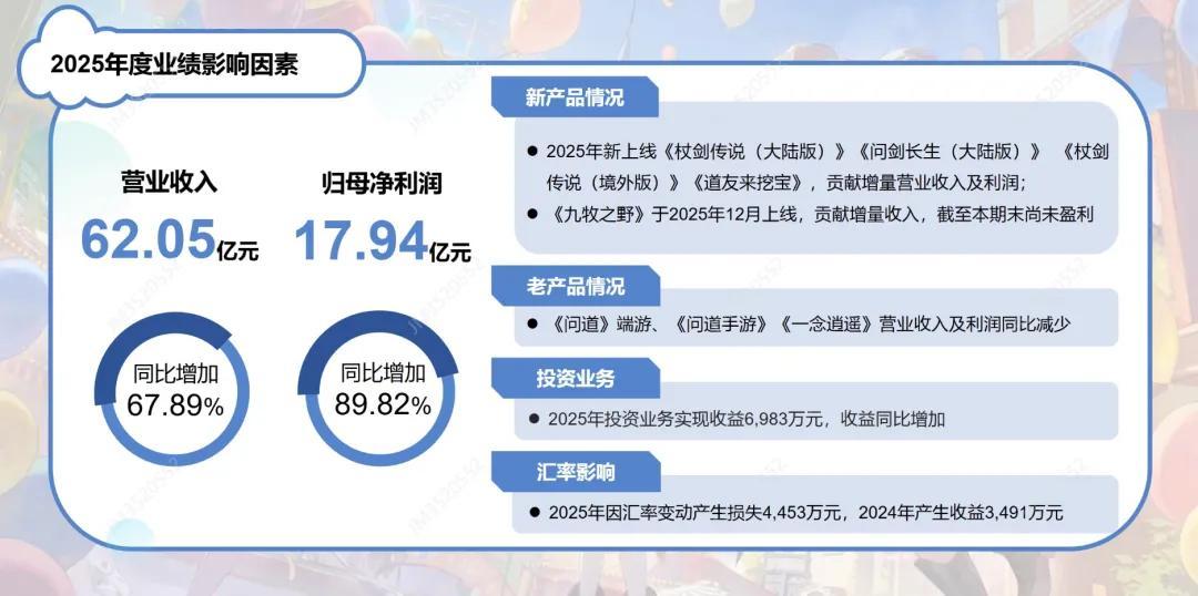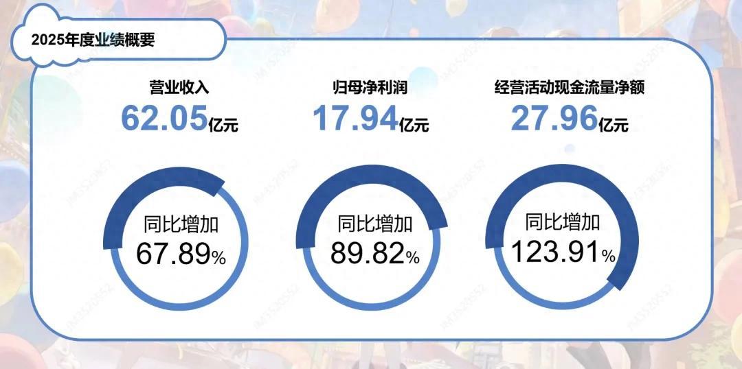 吉比特2025年營業收入達62.05億元(人民幣,下同),同比增長67.89%;利潤總額達25.04億元,同比增長94.60%;歸母淨利潤達17.94億元,同比增長89.82%。