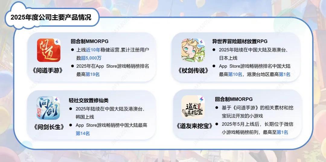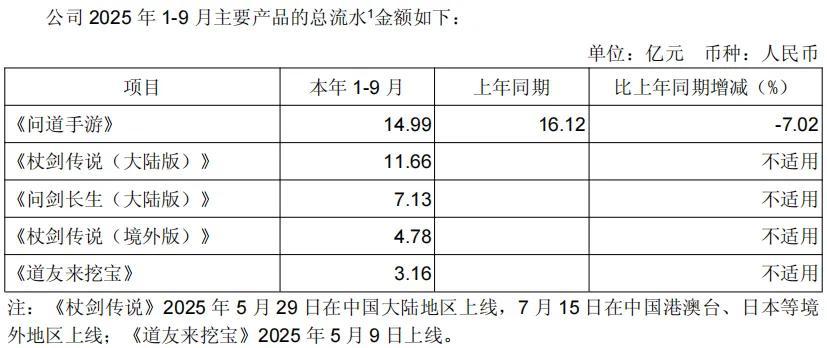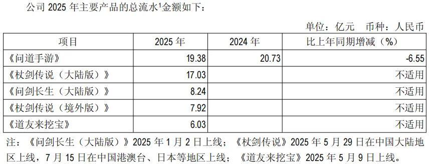 具體流水數據方面,據年報,2025全年,《問道手遊》流水19.38億元;《杖劍傳說》(國服)流水17.03億元;《杖劍傳說》(外服)流水7.92億元;《問劍長生》(國服)流水8.24億元;《道友來挖寶》流水6.03億元。