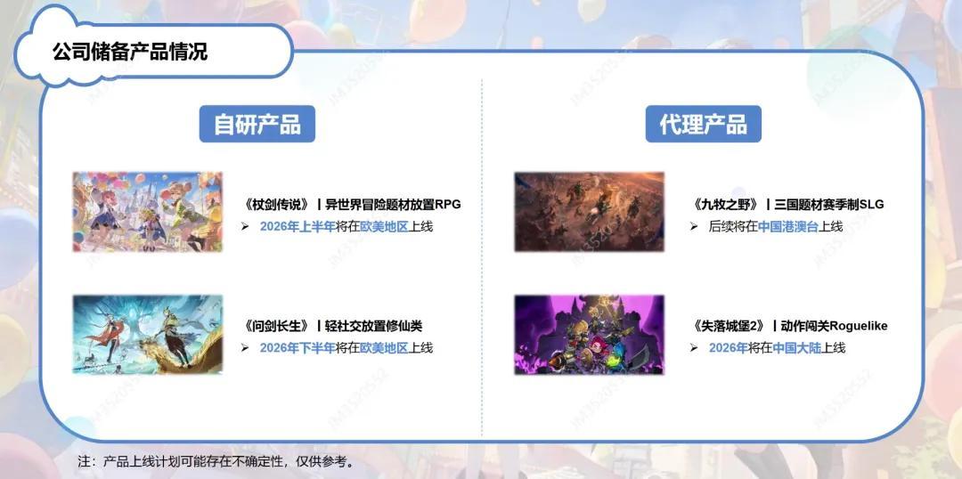 產品儲備方面,公司計劃於今年上半年在歐美地區上線《杖劍傳說》,於今年下半年在歐美地區上線《問劍長生》;另關於代理產品,計劃後續在中國港澳臺地區上線《九牧之野》,於國區上線《失落城堡2》。