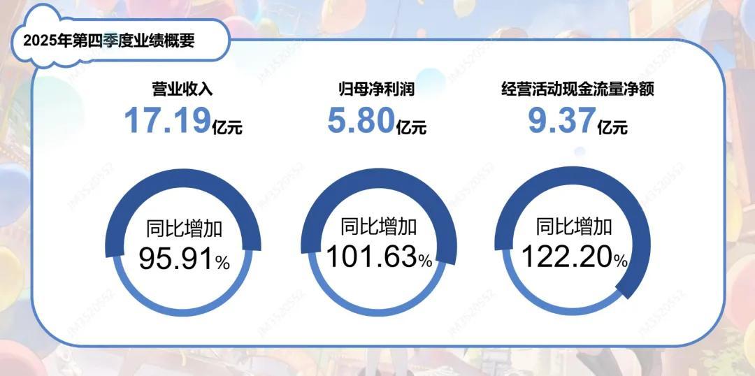 其中,2025Q4營業收入達17.19億元,同比增長95.91%;歸母淨利潤達5.80億元,同比增長101.63%。