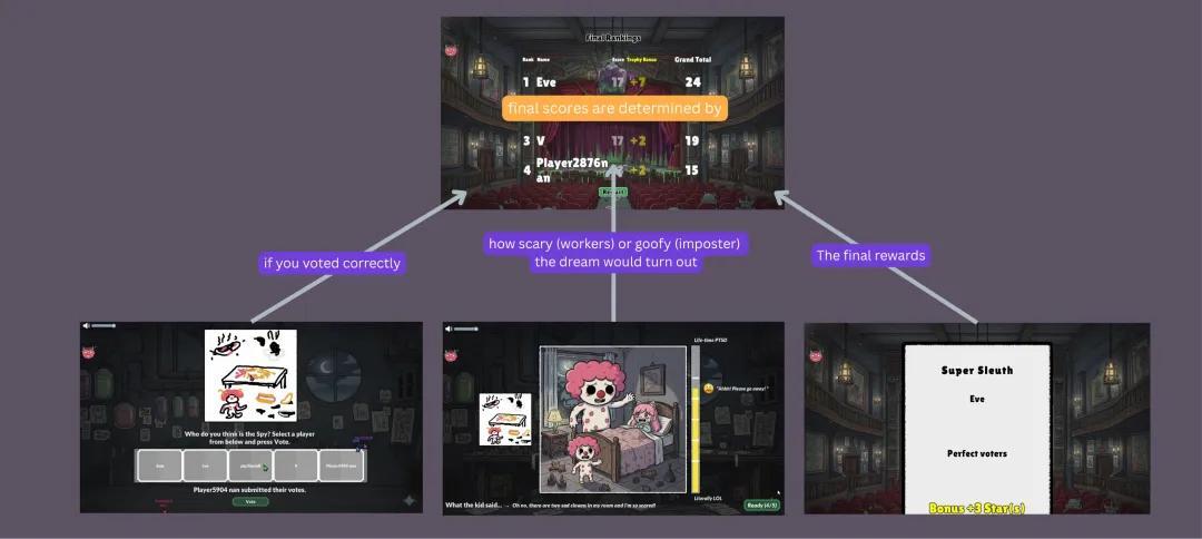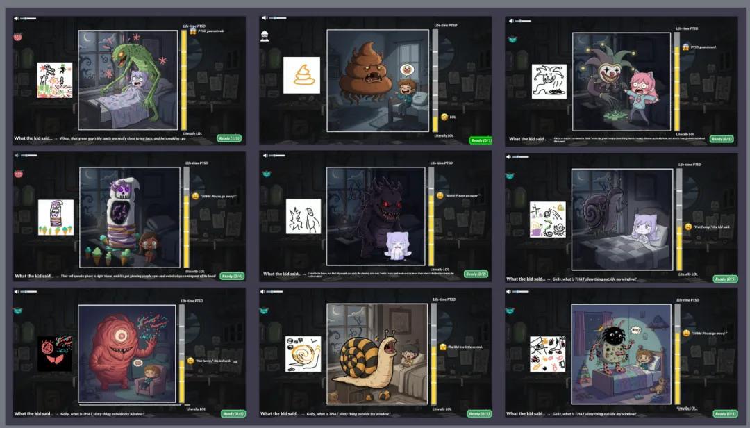 但參與者裏面會有一個臥底,他會悄悄地把搞笑元素加入到噩夢中,把恐怖作品變成滑稽的作品,去破壞噩夢,大家都畫完之後,AI會評判這個噩夢到底夠不夠嚇人,如果不夠嚇人,臥底就會獲勝。