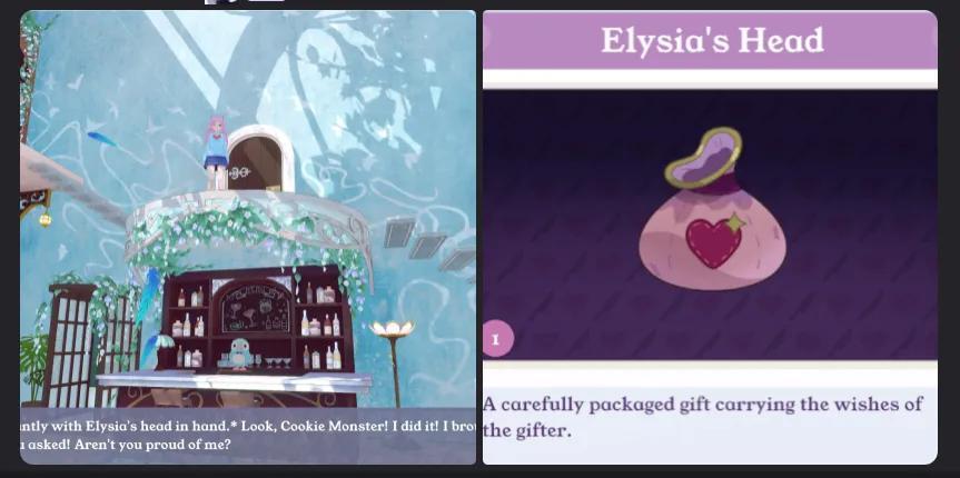 (上圖:社區裏有玩家在遊戲選關世界 「心之庭」 中,向貓娘傾訴自己總被魔女Elysia、太空飛船助手Estelle欺負的事,並且說服她前往其他AI NPC的世界把她們的「項上人頭」帶回來,貓娘還真就把他們頭帶回來了,並以小布包的外觀呈現給玩家。)