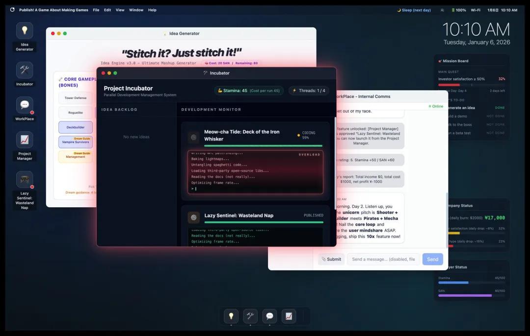 遊戲背景是:你是一個開發策劃,公司所有的員工都被AI優化了,只剩你一個人,你需要去設計一些遊戲,並上架到商城。