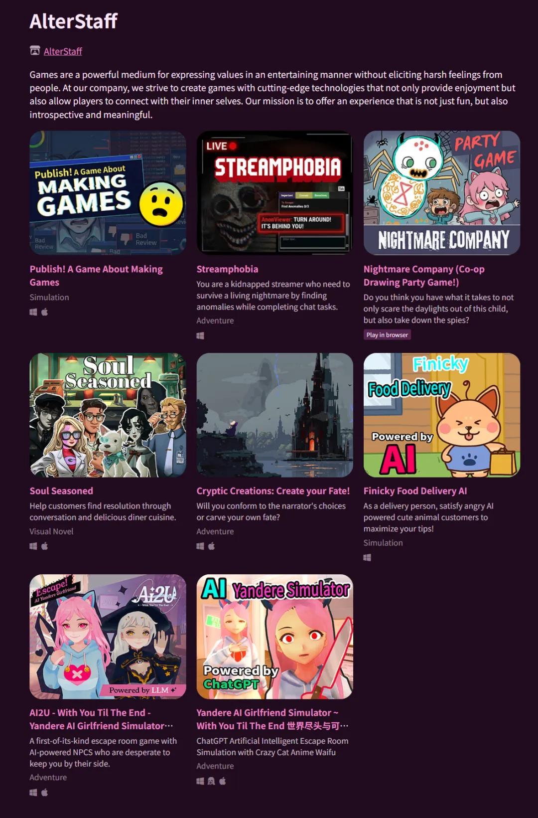 現在,大谷把所有的注都押在了AI原生遊戲上,除了《AI2U》,在itch.io上,他們團隊還上架了6款遊戲,全都是奔着AI原生的方向去的。