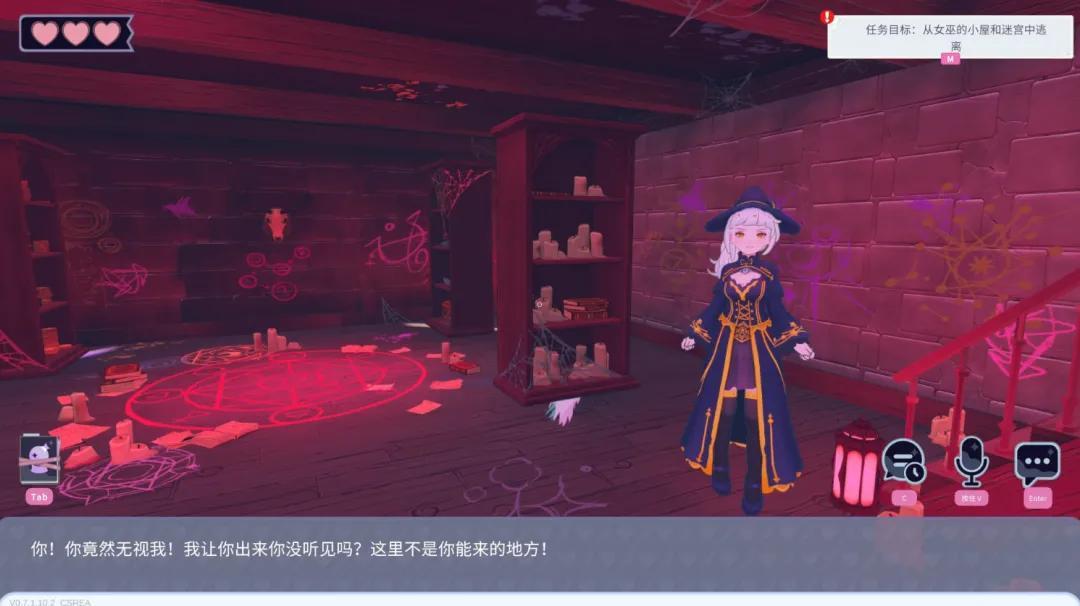 比如說:在第二章中,如果你想要順利逃跑,需要一些護盾藥水或快速藥水之類的道具,你要想辦法跟女巫交流,把藥水要到手;你在地下室研究如何啓動法陣的時候,要不停地關注女巫的心情,要用花言巧語、送禮物等方式把她哄好,讓她不至於把你攆出去。
