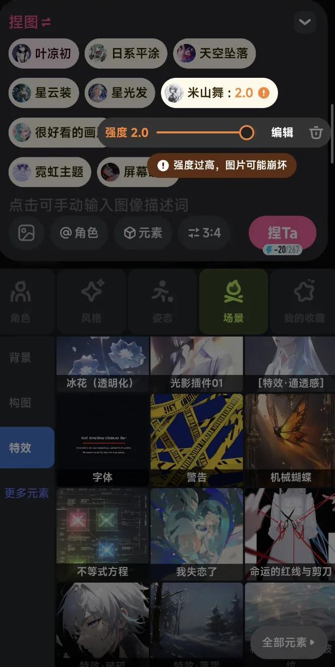最後,用戶創作有一定自由度。除了一鍵同款,捏Ta還把複雜的AI提示詞,變成了可視化標籤。用戶的創作像玩肉鴿遊戲:嘗試不同的標籤搭配、調整強度、構築流派,一鍵抽卡生成。