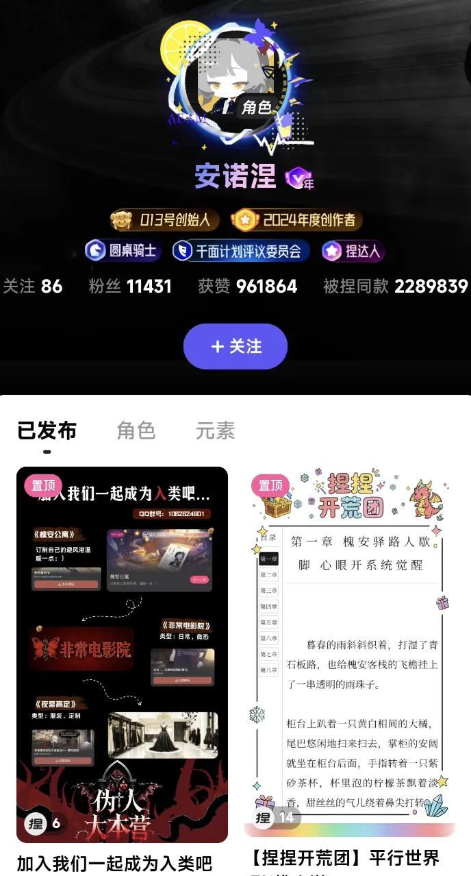 比如平臺裏熱度超400萬的「槐安公寓」。這不是官方設計的內容,而是玩家自發用AI角色、故事和模板拼湊出的微恐怪談世界。其中核心創作者“安諾涅”產出了4600多份作品,被普通用戶「捏同款」了228萬次。