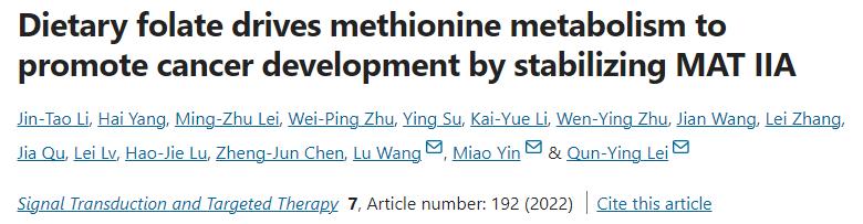 [1]. Li JT, Yang H, Lei MZ, Zhu WP, Su Y, Li KY, Zhu WY, Wang J, Zhang L, Qu J, Lv L, Lu HJ, Chen ZJ, Wang L, Yin M, Lei QY. Dietary folate drives methionine metabolism to promote cancer development by stabilizing MAT IIA. Signal Transduct Target Ther. 2022 Jun 22;7(1):192.