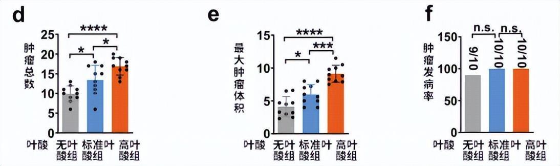 該研究在純化高脂飲食的小鼠身上進行,實驗者將小鼠分爲3組:葉酸攝入過高組(20mg/kg)、標準葉酸攝入組(2mg/kg)和無葉酸攝入組。5個月後,研究團隊發現,葉酸攝入過高組的小鼠肝癌發展迅速,腫瘤數量、體積遠大於其他組。