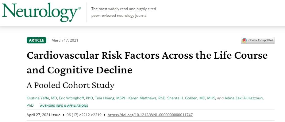 《神經 病學》上發表過一項研究,該研究對4項涉及15001名受試者的隊列分析,分別分析了青年人、中年人、老年人的數據。經過發現,成年早期心血管風險因素上升的人羣,老年時期認知障礙下降的風險也更大。