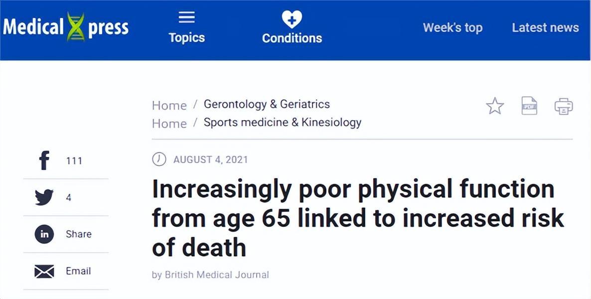 運動能力反映着身體健康和壽命長短,《英國醫學雜誌》上的研究指出,65歲後運動能力越差,發生死亡的風險也越高。在死亡來臨的10年前,身體就會出現明顯的運動力衰退表現。