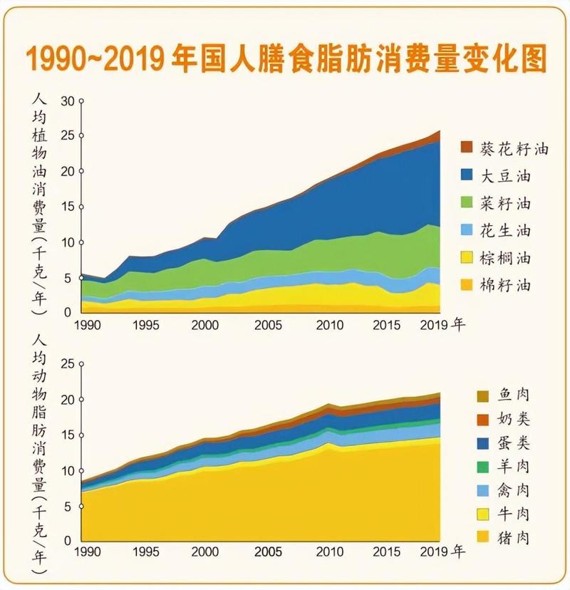 30年間,植物油人均年消費量從5.74千克增至25.84千克,每人每天消費約70.8克;動物脂肪人均年消費量從8.27千克增至20.56千克,每人每天消費約56.3克;油脂供能比由1992年的22%增長到2017年的34.6%。