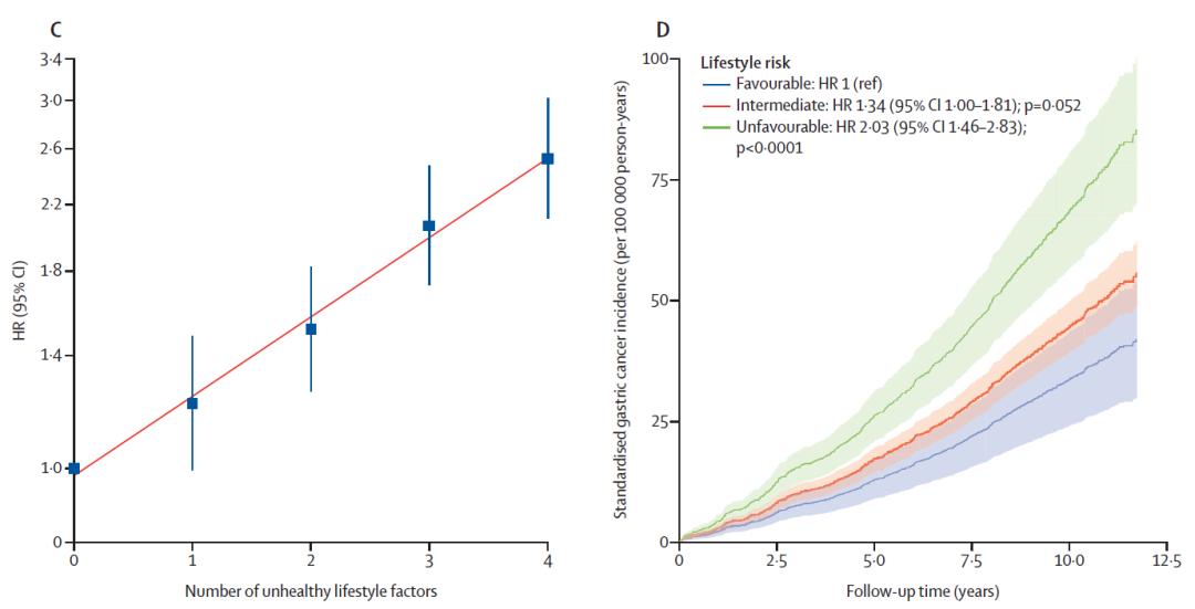 當中,胃癌遺傳風險最高的20%的受試者,胃癌發病風險增加108%;而在生活習慣方面的影響,與健康生活方式的人相比,生活方式一般以及生活方式不良的人,胃癌風險風險增加34%和103%。