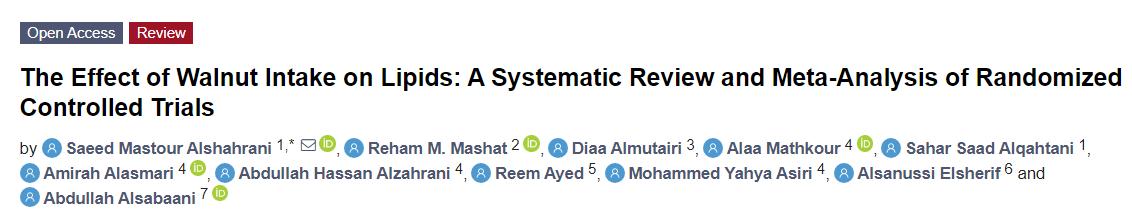 [2]Alshahrani SM, Mashat RM, Almutairi D, Mathkour A, Alqahtani SS, Alasmari A, Alzahrani AH, Ayed R, Asiri MY, Elsherif A, Alsabaani A. The Effect of Walnut Intake on Lipids: A Systematic Review and Meta-Analysis of Randomized Controlled Trials. Nutrients. 2022 Oct 23;14(21):4460.