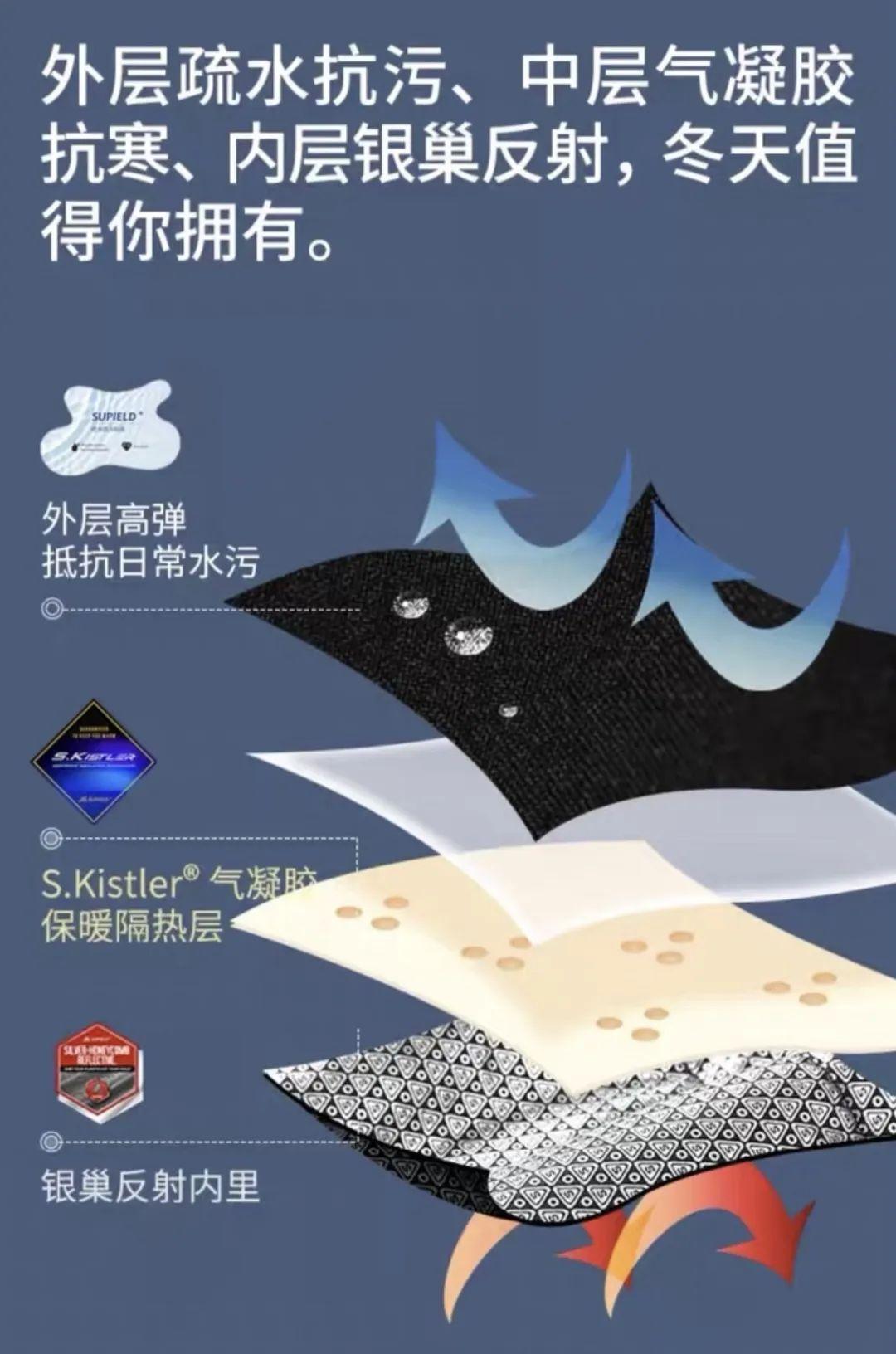 聲稱“航天級材料——氣凝膠製造”“薄薄一層比羽絨還保暖”的氣凝膠抗寒服,和普通羽絨服相比確實很薄。