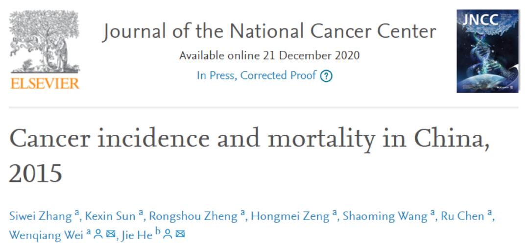 2020年12月21日,《國家癌症中心雜誌》刊登了一項研究,名爲“2015年中國癌症發病與死亡統計”。該研究以國家癌症中心最新數據爲基礎,調查範圍涵蓋了3.1億人口,相當於當年全國總人口的22.52%。這一研究更加全面、有代表性地呈現了我國癌症譜系的流行特徵和地區差異情況。