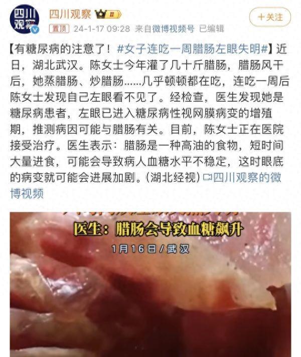 女子連喫一週臘腸後左眼失明,原因在血糖裏……