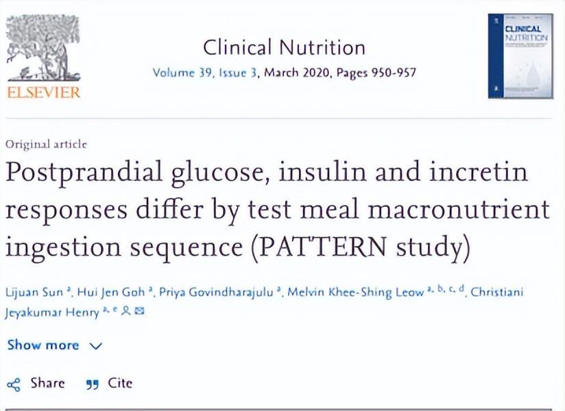 2020年,新加坡的研究人員進行了一項關於“第一口吃什麼對血糖的影響”的主題研究,並將研究結果刊登在《臨牀營養學》上。該研究旨在比較不同的進餐順序(蔬菜、肉類、主食,混合等)對身體血糖、胰島素和飽腹感的影響。