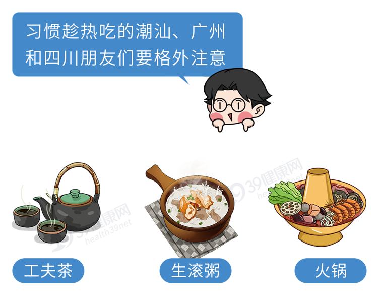 2016年,國際癌症機構將65℃以上的熱飲列爲了一類致癌物。長期進食過燙的食物,會顯著增加食管癌的發生風險,包括但不限於熱茶、熱湯等,只要是過燙的食物都會增加風險。