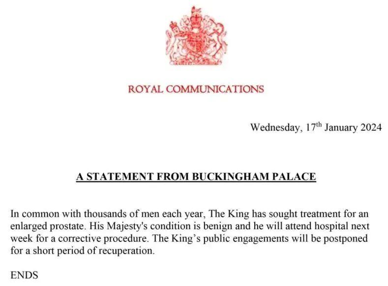 當地時間1月17日,英國王室突然宣佈,國王查爾斯三世因前列腺增生需要治療。白金漢宮在聲明中說:“與每年數以千計的男性一樣,國王因前列腺增生尋求治療。”